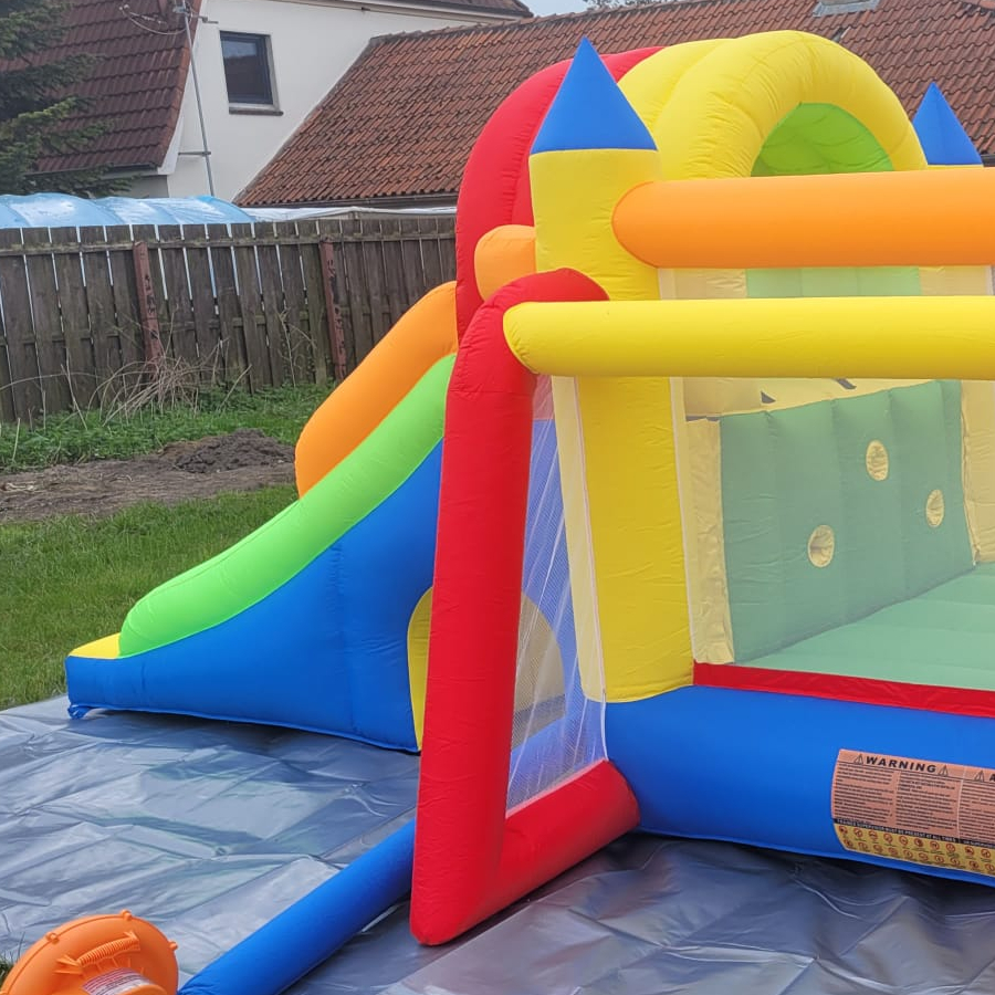 Alles was Sie für den Betrieb benötigen, bekommen Sie von uns mit. Sie brauchen nur einen Stromanschluss. Der Blasmotor muss während der Betriebszeit laufen. Zum Aufbau der Hüpfburg werden i.d.R. eine Person und ca. 5 Minuten benötigt.